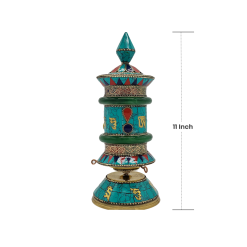 The Tibetan Mani Wheel is both a sacred object in a spiritual sense as it is a physical aid for meditation. Turned with purpose, it is said to create beneficial karma as it sends out blessings to sentient beings everywhere. The auspicious imagery in combination with the sacred mantras creates an atmosphere of peace and mindfulness, so it can be placed in prayer rooms, meditation rooms, or personal altars.